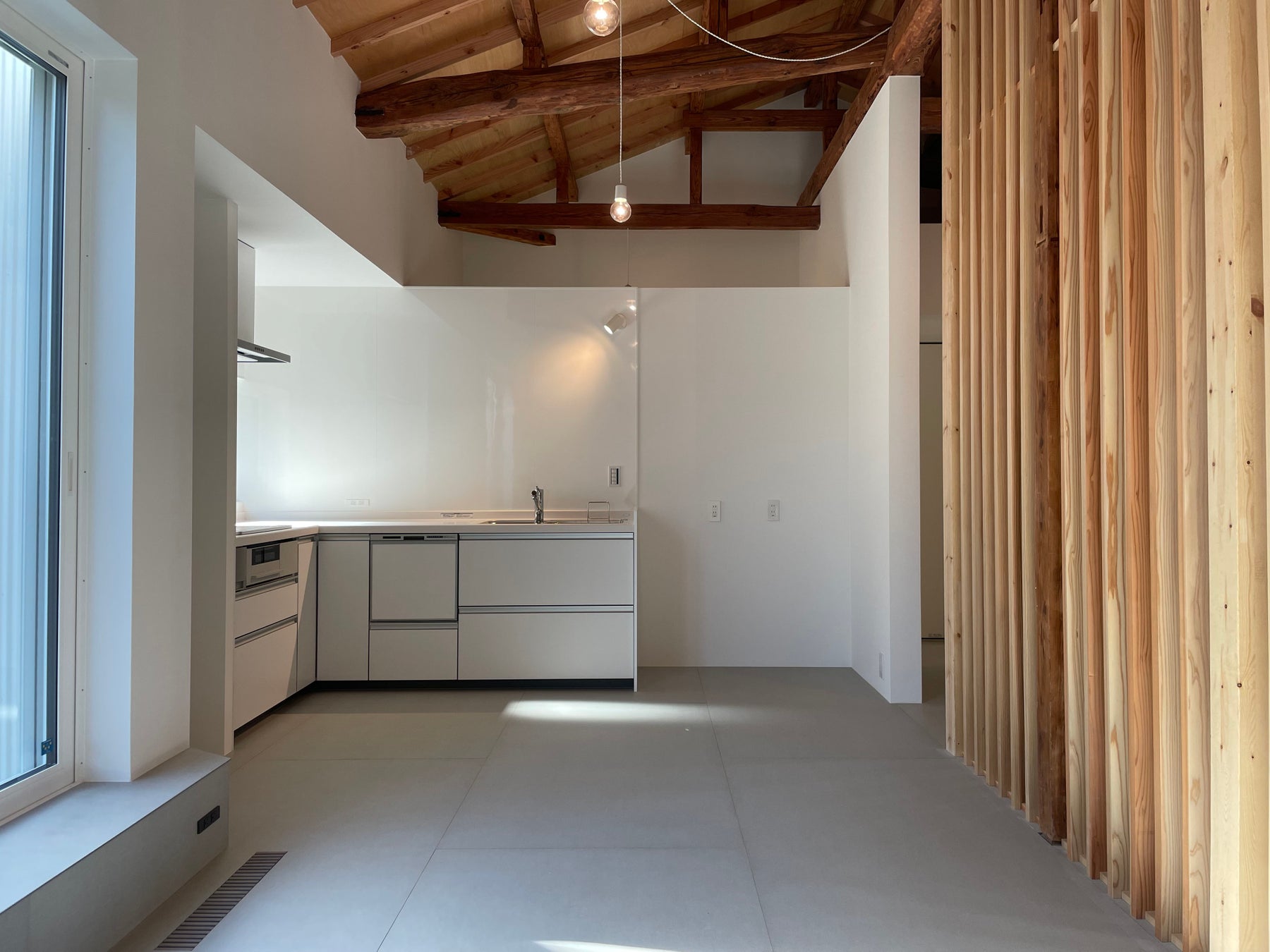 仕切りの多かった1階はオープンなLDK間取りに変更。2〜3人のご家庭を想定した作りとなっています。格子を使い、緩やかに空間を区切り、天井は作らず、既存の太い梁を活かした開放的な空間にしました。