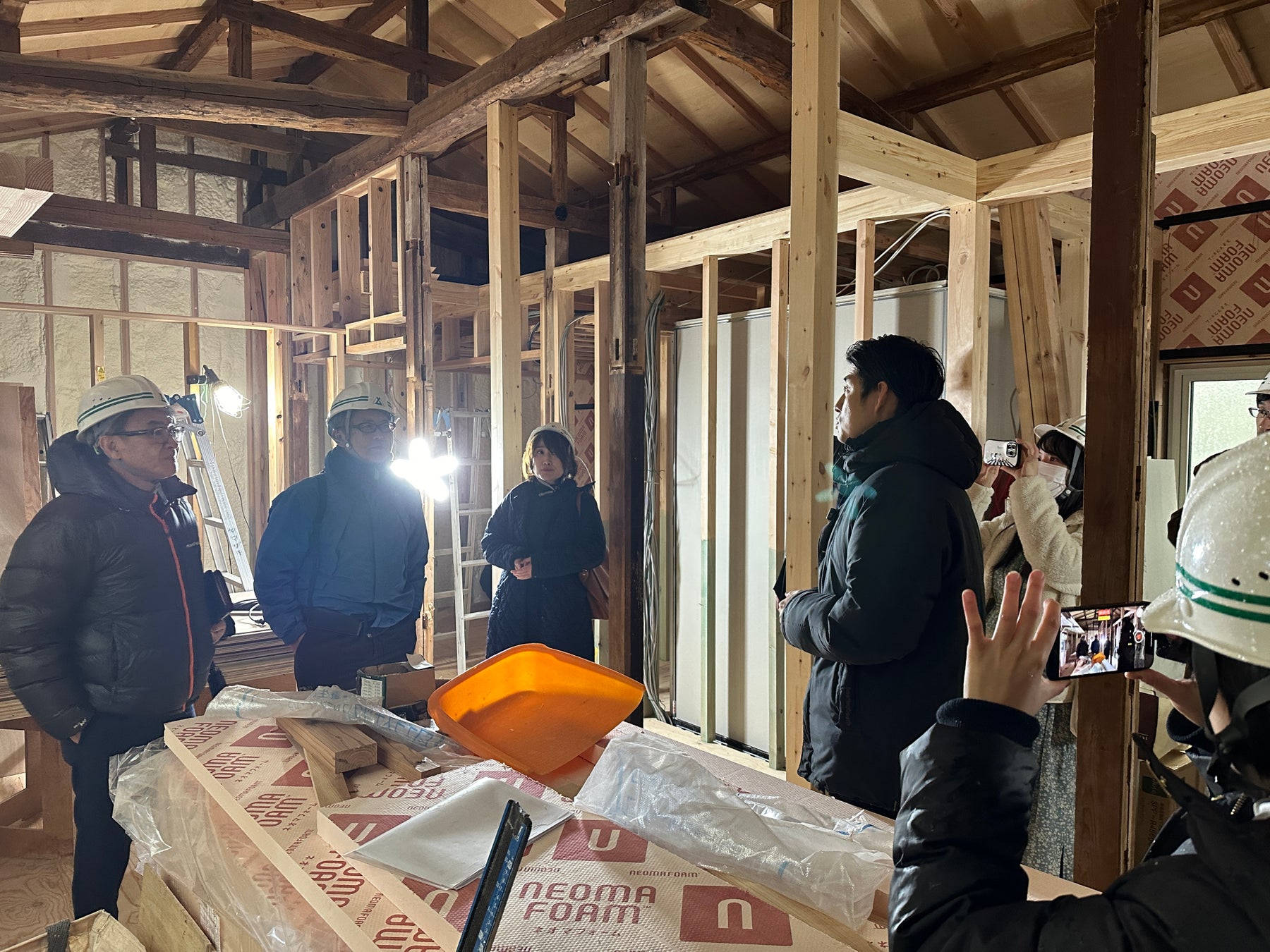 プロジェクトの進行は富山県公式YouTubeにて定期的に発信されました。また、実際の富山型ウェルビーイングの住宅版を定義するため、県の検討委員会の方々と断熱施工後と完成後に内覧会を行いました。