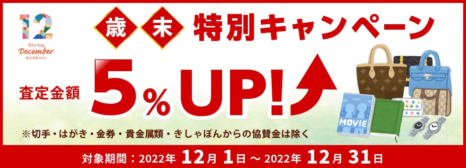 提携する「きしゃぽん募金」(運営:嵯峨野株式会社)に品物を送った場合は査定した金額が寄付となり、団体に振り込まれます。現在、2022年12月31日まで買取額UPキャンペーンを実施中です。買取対象品等は「きしゃぽん募金」WEBよりご確認下さい。