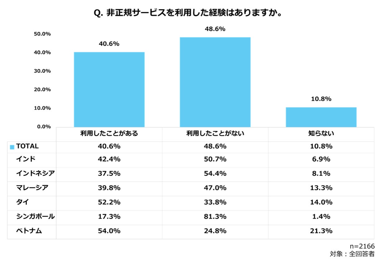 アニメ視聴プラットフォームについては、非正規サービスを利用したことがない(48.6%)が利用したことがある(40.6%)を全体として上回る結果となりました。国別で見るとベトナム、タイでは依然として非正規サービス利用経験者が優勢です。