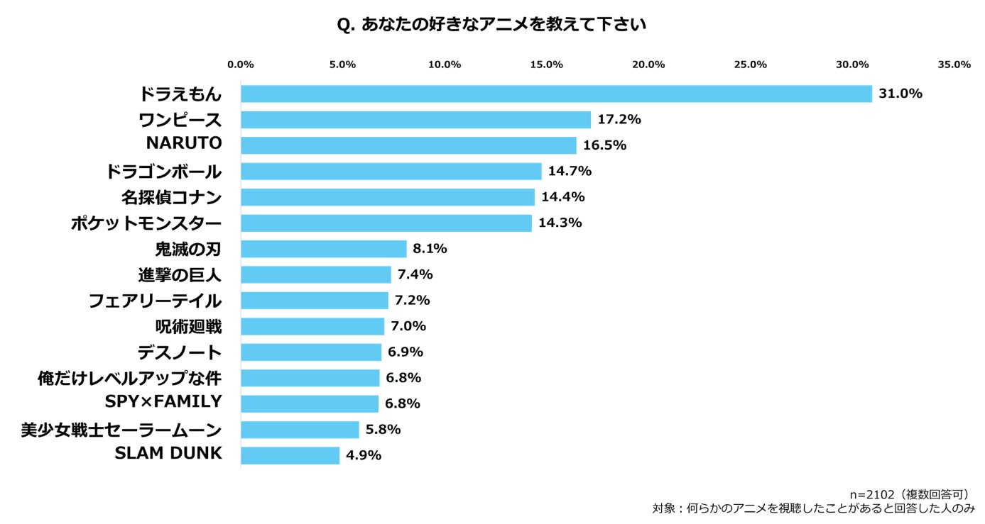 ・人気アニメは上位から、『ドラえもん』(31.0%)、『ワンピース』(17.2%)、『NARUTO/BORUTO』(16.5%)、ドラゴンボール(14.7%)と、マンガ同様に長寿作品の人気が高い傾向。