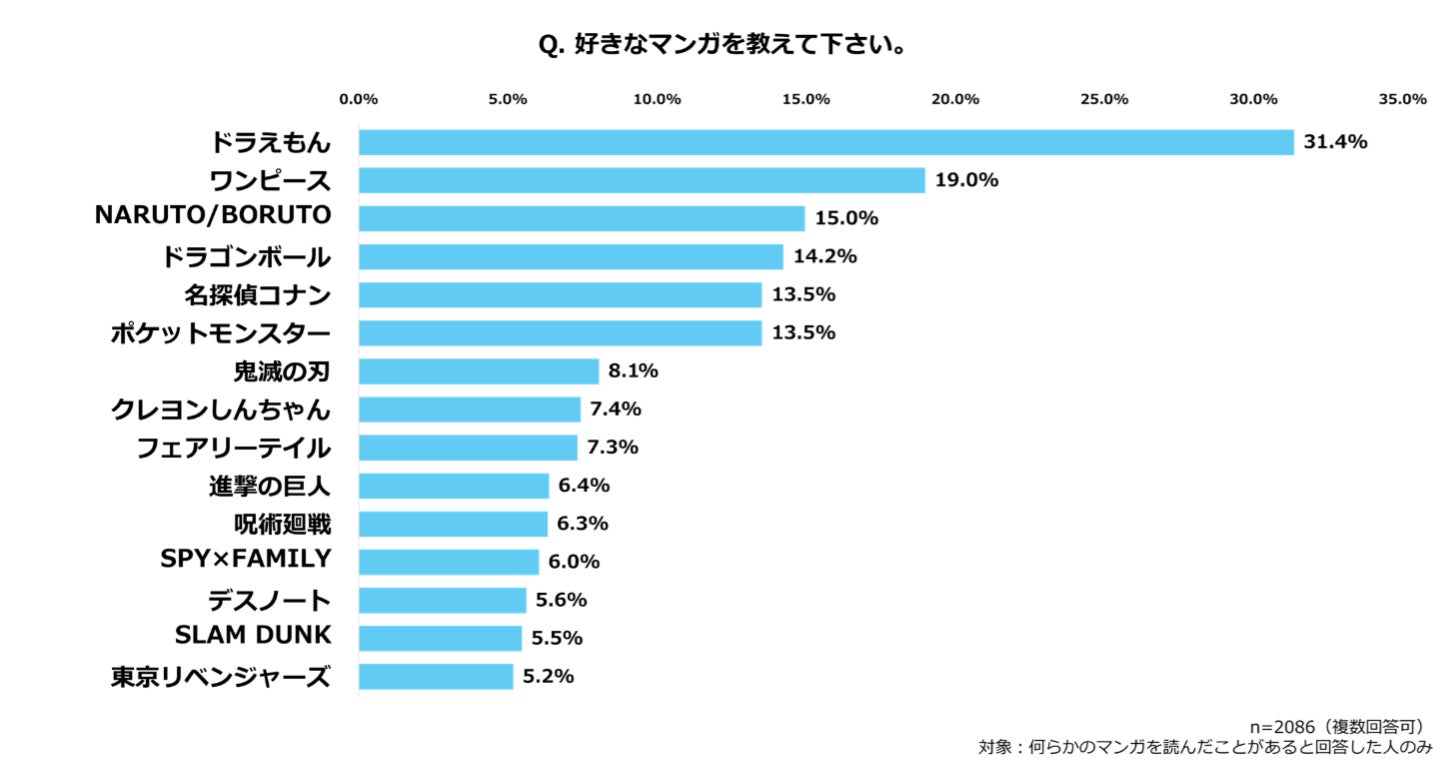 好きなマンガは上位から『ドラえもん』(31.4%)、次いで『ワンピース』(19.0%)、『NARUTO/BORUTO』(15.0%)となり、10年以上継続している作品群が上位を占めました。近年の作品群では、『鬼滅の刃』(8.1%)、『進撃の巨人』(6.4%)、『呪術廻戦』(6.3%)などが人気を集めるも、10.0%未満にとどまりました。