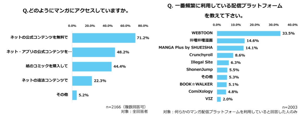 頻繁に利用しているマンガプラットフォームは、1位「WEBTOON」(33.5%)、2位「哔哩哔哩漫画(bilibili漫画)」(14.6%)、3位「MANGA Plus by SHUEISHA」(14.1%)の順となり、これらが4位以下を大きく引き離し、3強を形成しています。