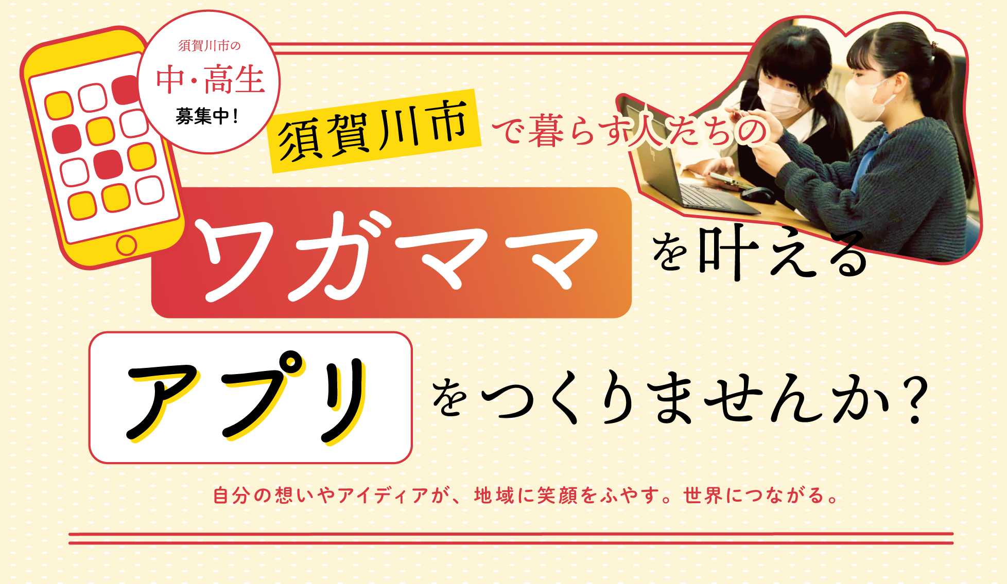 須賀川南部地区では、令和3年1月に「須賀川南部地区エリアプラットフォーム」を構築し、令和4年3月には未来ビジョン「みちしるべ」を策定しました。そこで設定した「10のみちしるべ」のうちの2つである「中高生が自分の将来をイメージできるまち」「先端技術を導入し便利で快適なスマートなまち」の実現を目指し、中高生を対象としたアプリ開発プログラム「須賀川ワガママLab」を実施します。