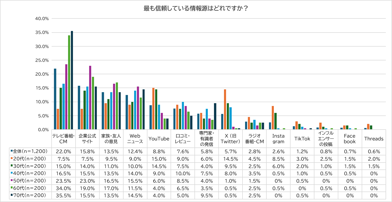 また、50代・60代では他媒体よりも「企業公式サイト」「家族・友人の意見」への信頼が高く、情報の真偽を重視する傾向が強いことがうかがえます。