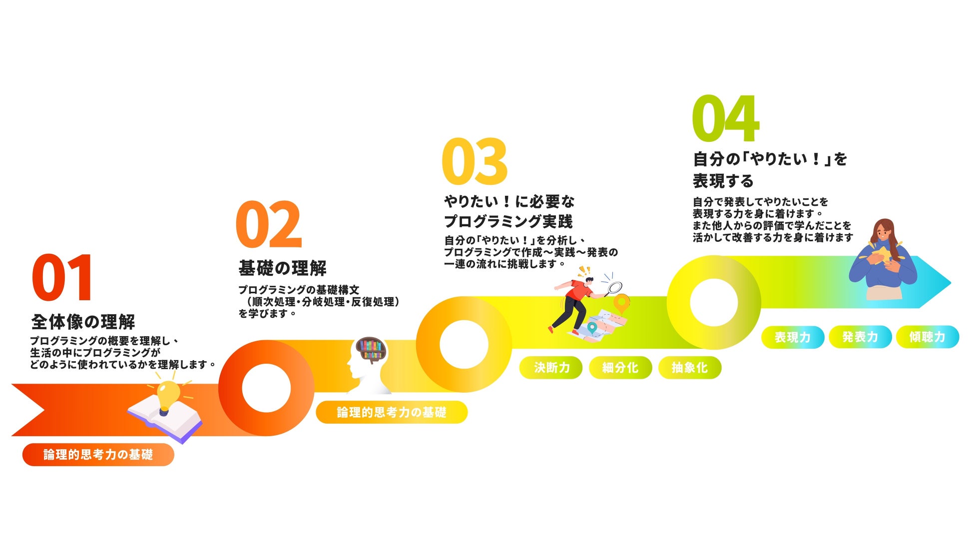 やりたい!の実現には欠かせないプログラミング。小学生のうちからプログラミング的思考を定着させ、自分の夢や目標に、自主的に逆算し、行動できるチカラを育みます。