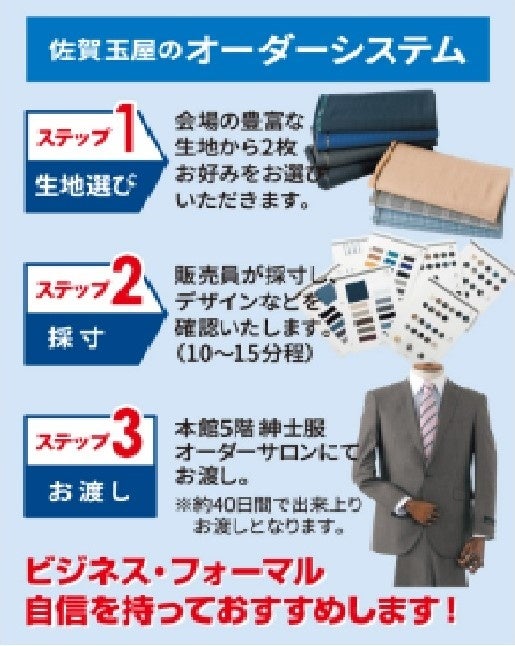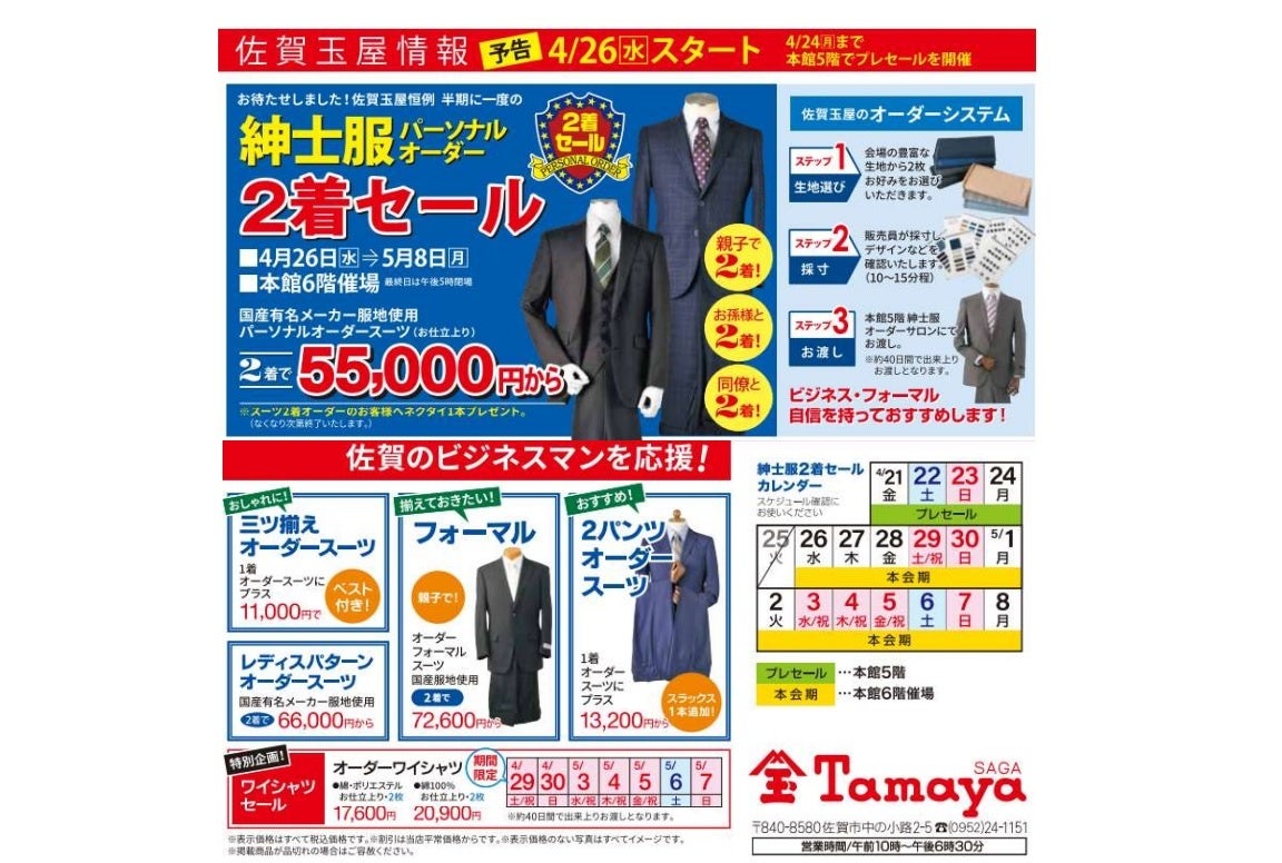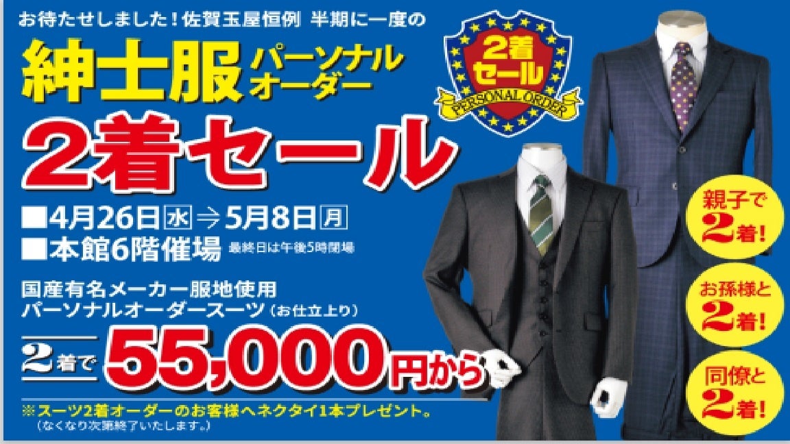 佐賀玉屋恒例の「半期に一度の2着セール」を4月26日(水)~5月8日(月)まで開催いたします!国産有名メーカーの服地を使ったパーソナルオーダースーツが2着で55,000円から!さらにお得な特典も!