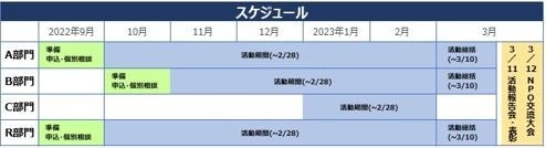 1つ目は社会貢献事業の開始を考える団体にスタートアップしてもらう部門、2つ目は現在活動中の団体に仲間を増やしてもらい、他団体ともつながってもらう部門、3つ目は興味や関心をもった内容に対して、特設ホームページから応援メッセージを投稿もらう部門(個人でも団体でもOK/2023年1月~2月28日)、4つ目は継続してきた活動の成果を見える化してもらい、仲間と共有してもらう部門です。