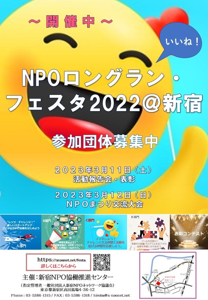 【NPOロングラン・フェスタ2022@新宿】スタートしています! 参加団体募集中。参加団体は実務家・専門家グループに情報や知見を提供してもらうチャンスです。2023年3月まで開催!