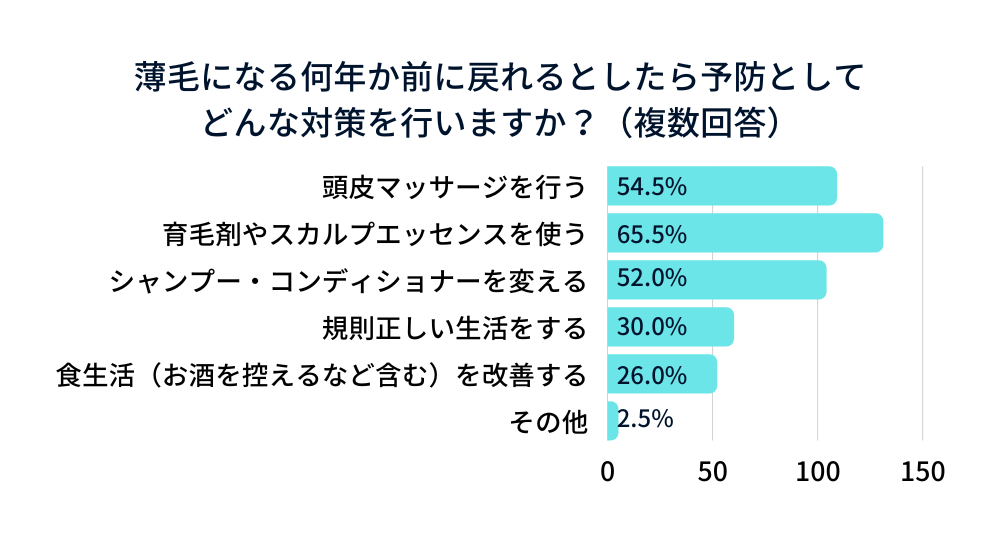 「薄毛になる何年か前に戻れるとしたら、予防としてどんな対策を行いますか?」の問いに対しては65.5%の男性が「育毛剤やスカルプエッセンスを使う」と回答して選択肢の中では最多の回答を集めました。