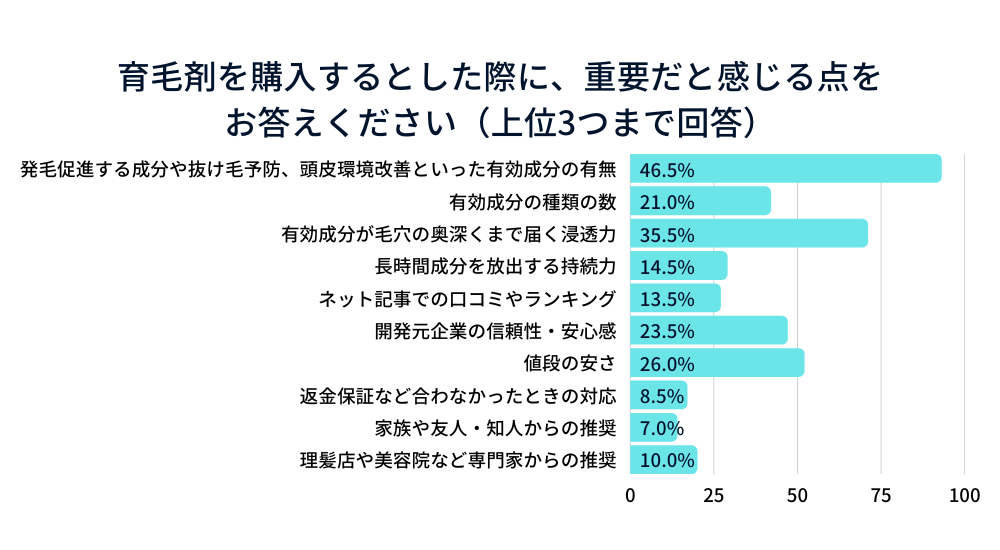 「育毛剤を購入するとした際に重要だと感じる点」という問いに対しては「発毛促進する成分や抜け毛予防、頭皮環境改善といった有効成分の有無」と回答した方が46.5%でもっとも多くの回答を得ました。