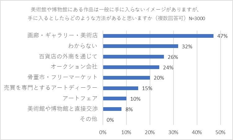 最後に「美術館や博物館にある作品は一般に手に入らないイメージがありますが、手に入るとしたらどのような方法があると思いますか」(複数回答可)と回答者全員に尋ねました。その結果「画廊・ギャラリー・美術店」が47パーセントでトップとなりました。2位には「わからない」との回答が32パーセントで入り、3位以下は「百貨店の外商を通じて」(26パーセント)、「オークション会社」(24パーセント)、「骨董市・フリーマーケット」(20パーセント)、「売買を専門とするアートディーラー」(15パーセント)、「アートフェア」(10パーセント)との結果になりました。