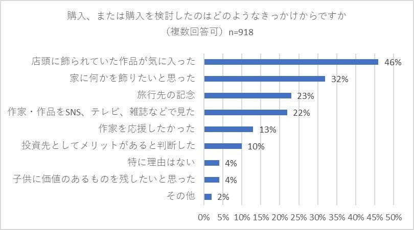 次に「美術品を購入、または購入を検討したことがある」と回答した918名の方に「購入、または購入を検討したのはどのようなきっかけからですか」(複数回答可)と尋ねたところ、「店頭に飾られていた作品が気に入った」との回答が46パーセントでトップとなりました。以下、「家に何かを飾りたいと思った」(32パーセント)、「旅行先の記念」(23パーセント)、「作家・作品をSNS、テレビ、雑誌などで見た」(22パーセント)との回答が続きました。