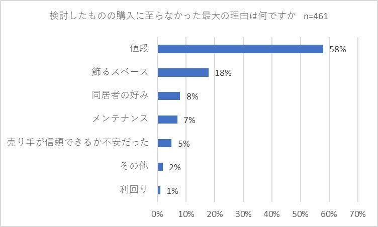 今度は、美術品の「購入を検討したことがある」と回答した461名に対して「検討したものの購入に至らなかった最大の理由は何ですか」との質問を行いました。その結果、「値段」との回答が58パーセントで、他の回答に大きな差をつけてトップとなりました。2位は「飾るスペース」(18パーセント)、3位は「同居者の好み」(8パーセント)となりました。