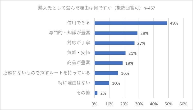 購入先として選んだ理由トップ3は「信用できる」「専門的・知識が豊富」「対応が丁寧」