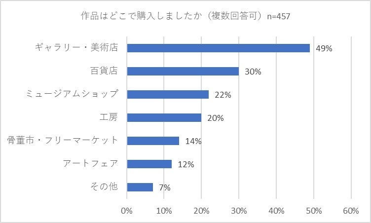 また、美術品を「購入したことがある」と回答した457人に「作品はどこで購入しましたか」(複数回答可)と質問しました。最も多かった回答は「ギャラリー・美術店」(49パーセント)でした。「百貨店」も30パーセントと多くの回答を集めました。それ以外では「ミュージアムショップ」(22パーセント)、「工房」(20パーセント)、「骨董市・フリーマーケット」(14パーセント)、「アートフェア」(12パーセント)などの回答がありました。