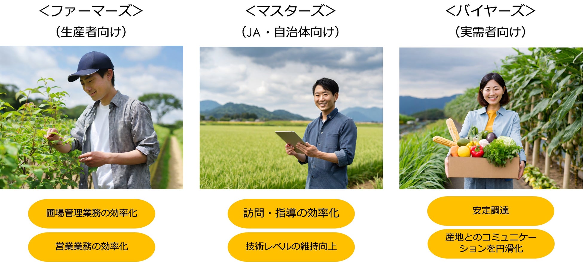 現在、生産現場でご活用頂くためのバージョン「GrowthWatcherファーマーズ」、自治体・JAの皆さまにご活用頂くためのバージョン「GrowthWatcher マスターズ」、実需者の皆さまにご活用頂くためのバージョン「GrowthWatcherバイヤーズ」の3つのバージョンを展開しています。