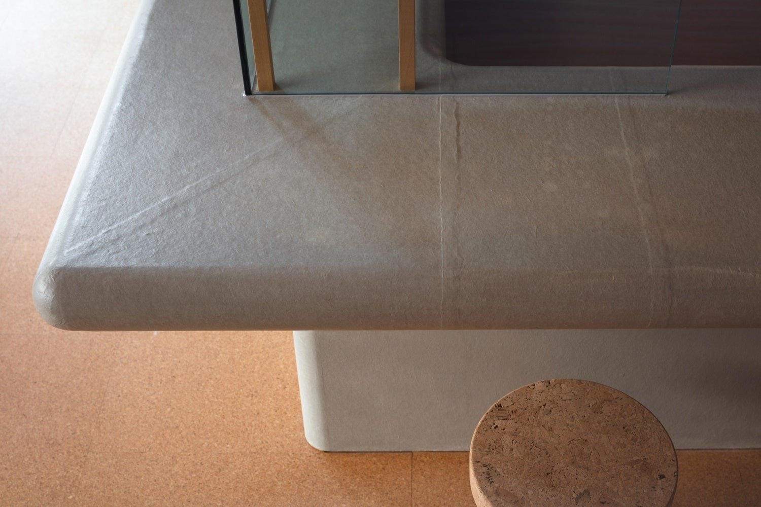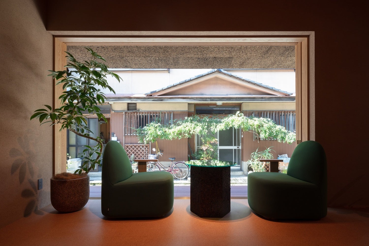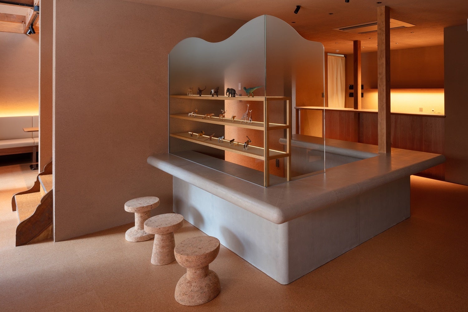 内外装には射的に使われるコルクガンの“コルク”を活用しています。床材は今となっては懐かしいコルクボードを使い子供の足に優しいクッション性を取り入れ、壁と天井の左官には細かく砕いたコルクを混ぜ込むことで消臭効果を生み出す工夫を施しています。また、ジャスパーモリソン氏がデザインしたコルクの椅子なども取り入れ、コンセプトにちなんだものも取り揃えました。