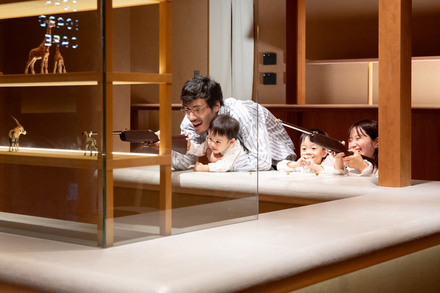 銃を持って肘をつくカウンターのコーナーは大きなR型にしており、柔らかい素材(和紙)でコ ーティングすることで安全性や子供が親しみやすいデザインにしました。和紙の提案・施工は紙漉キハタノ氏によるもの。隣の商品棚や後ろ面のカウンターも同素材を使用しています。