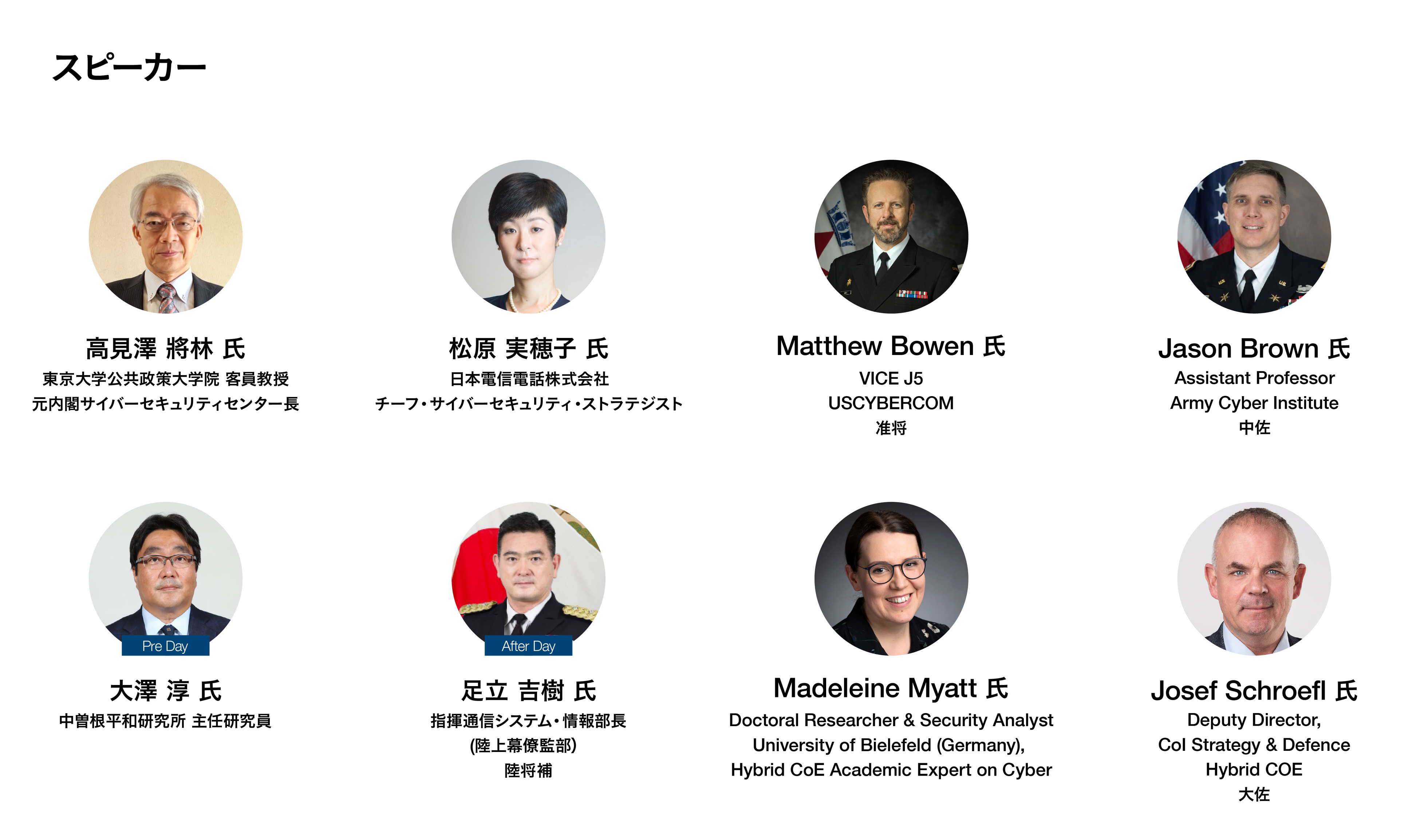 今回メインデイ二日間はオンラインにて総勢53名の専門家の方々に登壇・議論いただくことになりました。今回も陸軍サイバー研究所(米国)、NATO サイバー防衛協力センター、台湾国家防衛セキュリティ研究所など様々な防衛関連機関からご参加いただくだけでなく、産官学の専門家の方々に参加いただくことが決定しました。詳細は別紙のスピーカー一覧表をご覧ください。