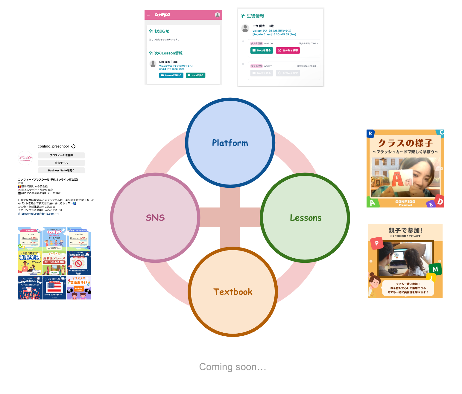 白金数理は「家庭内での学習が何よりも重要である」という教育観を持ち、レッスンでは子どもが体験し、楽しむことに重点を置いています。そのレッスンの背景的情報は SNS と Textbook の両面から得ることができ、SNS では簡易的ではあるがエッセンスの詰まった情報をわかりやすく、Textbook ではより詳細に親自身が興味を持てるように設計されています。また、Platform ではレッスンの準備物の確認や休講・振替の申請、今まで子ども学んだ軌跡(単語、フレーズ、文化)の閲覧などができるようになっています(Platform は今秋リリース予定)。
