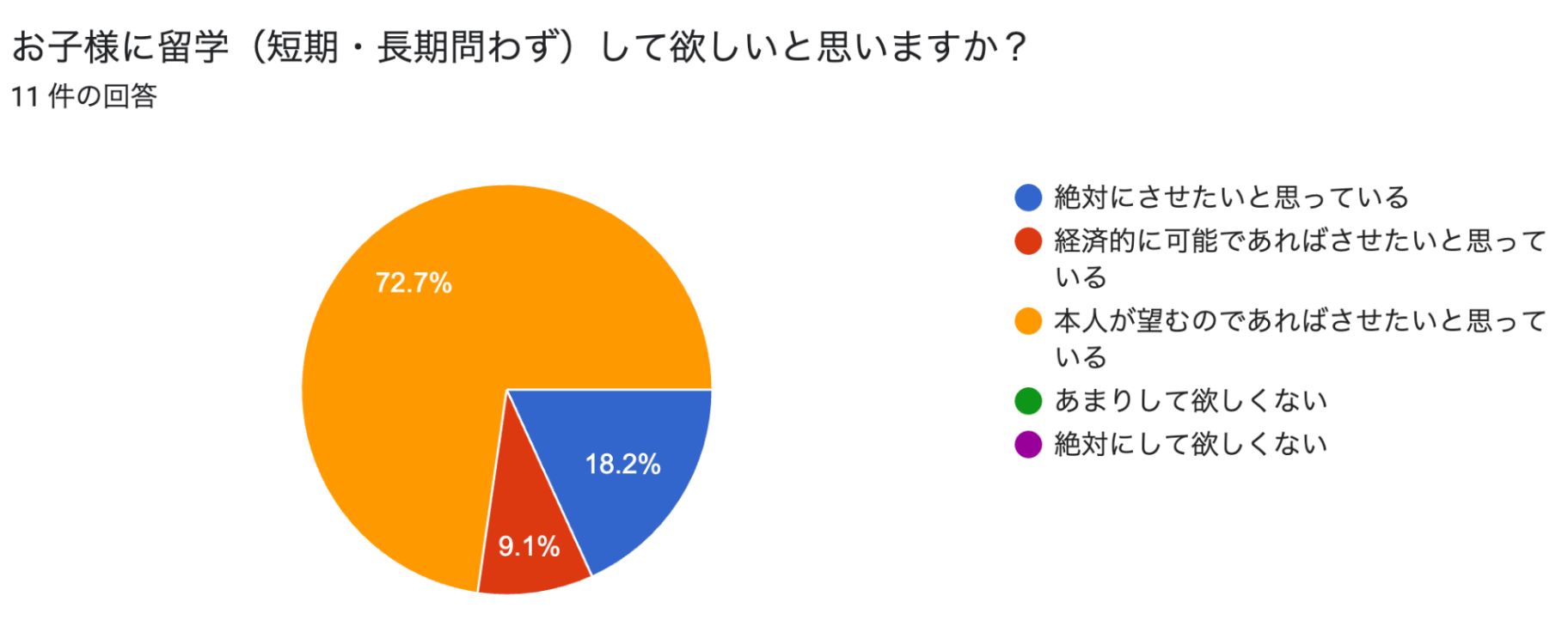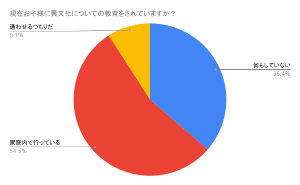 Confido Preschool 多文化理解クラスの受講者並びに同サービスの公式SNSアカウント(@confido_preschool)のフォロワーを中心とした調査で、子どもに英会話を学ばせる親のほとんどが留学を意識しているということが明らかになりました。一方で、英会話は学ばせているものの、多文化教育については特に何もしていないという親は 40% にのぼりました。留学とは他文化圏で生活を営むことであり、相手の文化に敬意をもって過ごさなければならず、多文化理解は言語教育と同等もしくはそれ以上に重要であると同社は考えています。