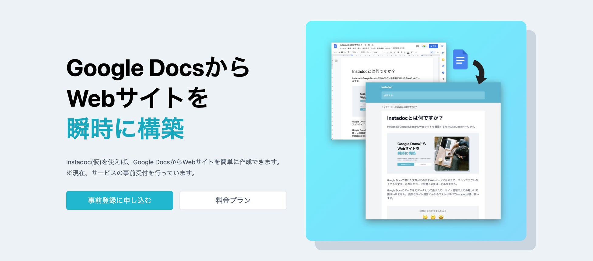 Instadoc(仮名、サービス名は正式ローンチ時に変更の可能性あり)は、Google Docsで用意したドキュメントデータを元にWebサイトを構築するためのNoCodeサービスです。