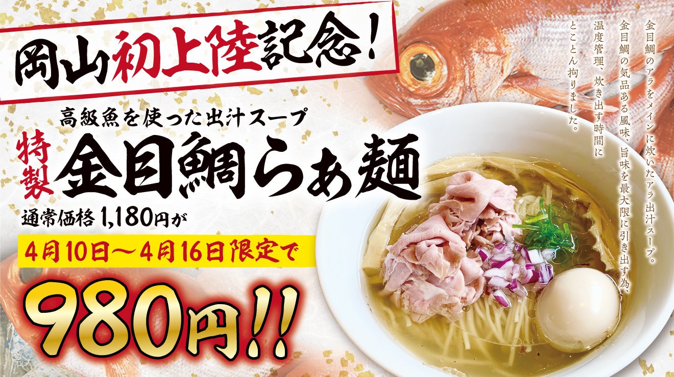 【岡⼭初上陸】「らぁ麺さくら⽥」にて、新宿の名店・らぁ麺 鳳仙花の「金目鯛らぁ麺」限定販売!提供開始の4月10日(月)より7日間、特製金目鯛らぁ麺を200円引きの980円で提供するキャンペーンを開催!
