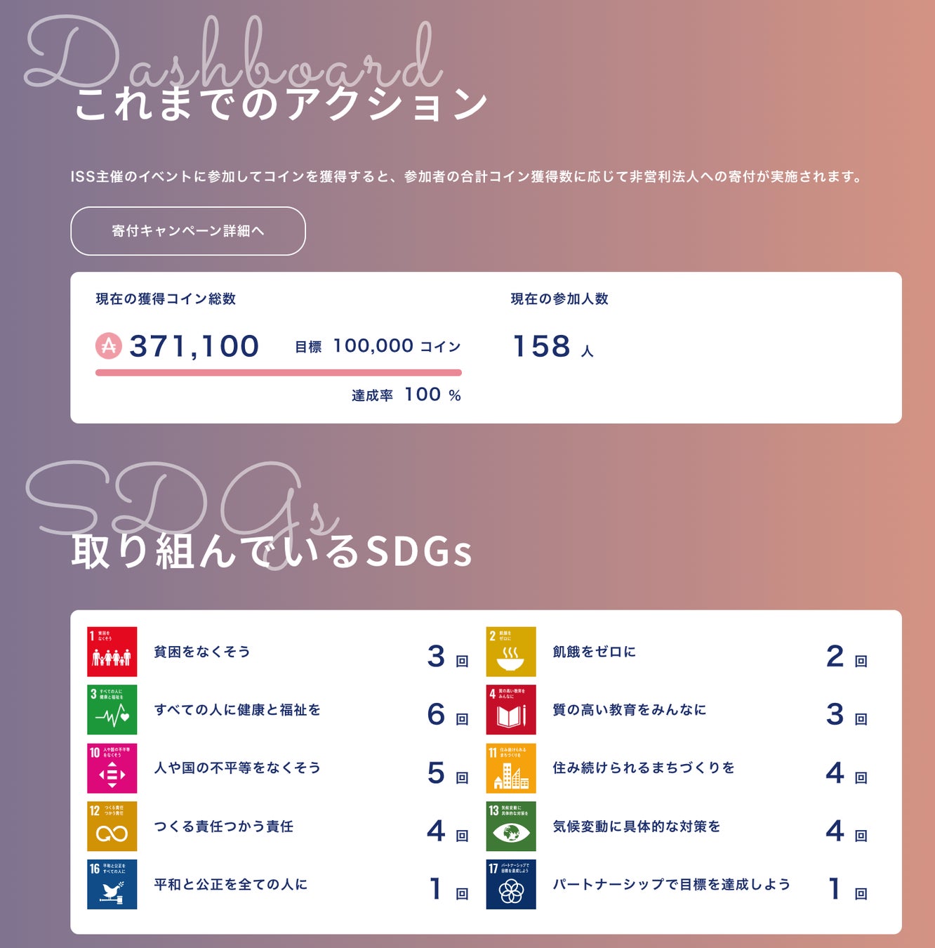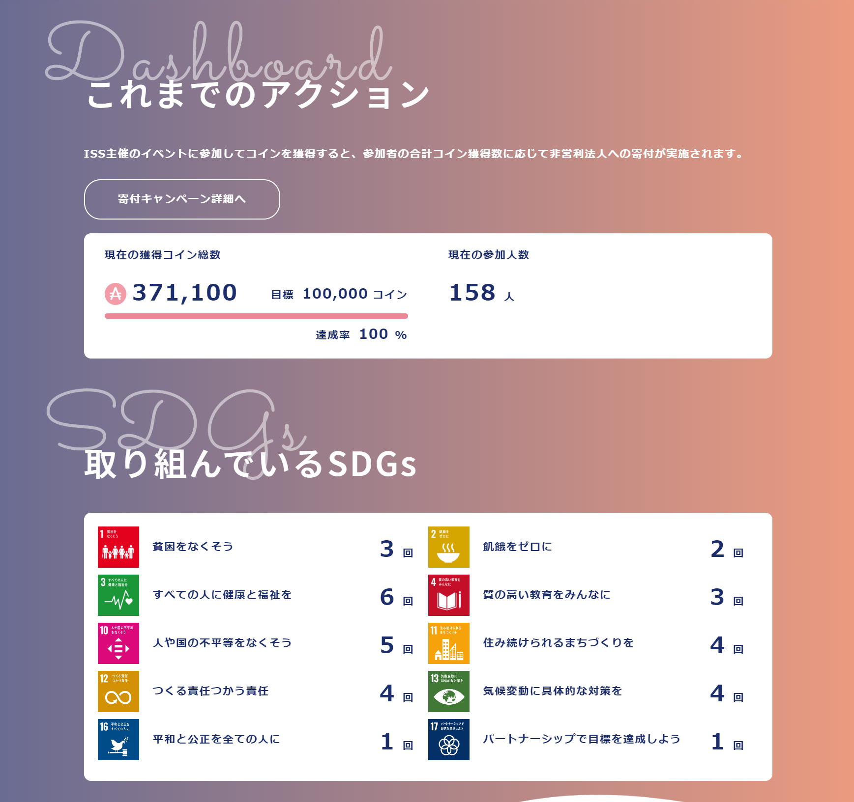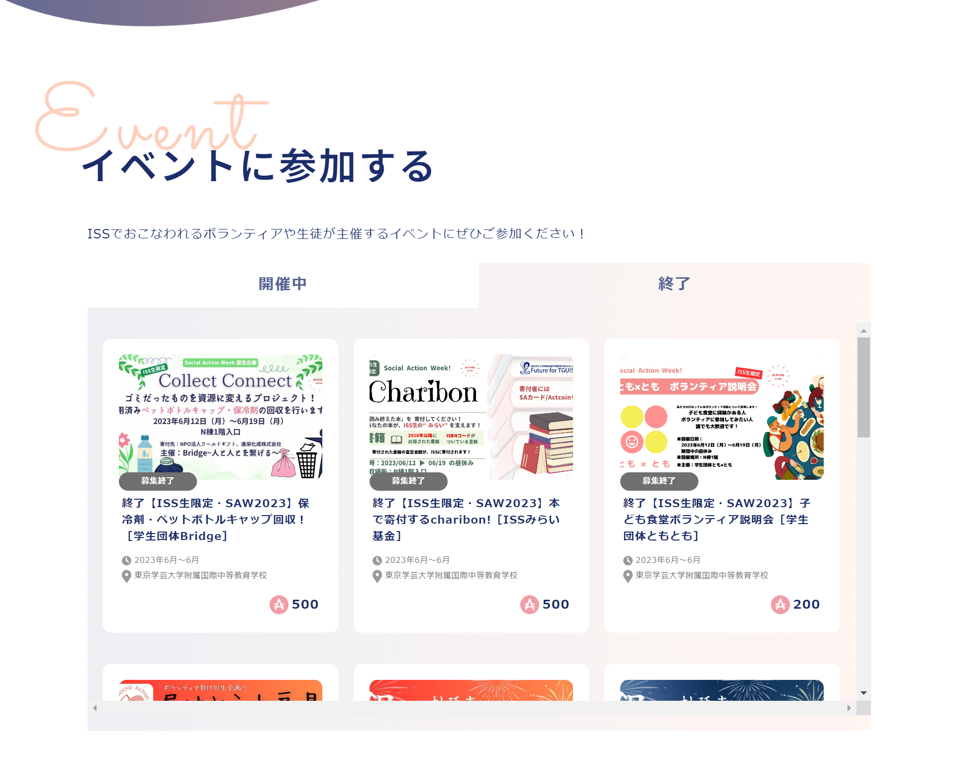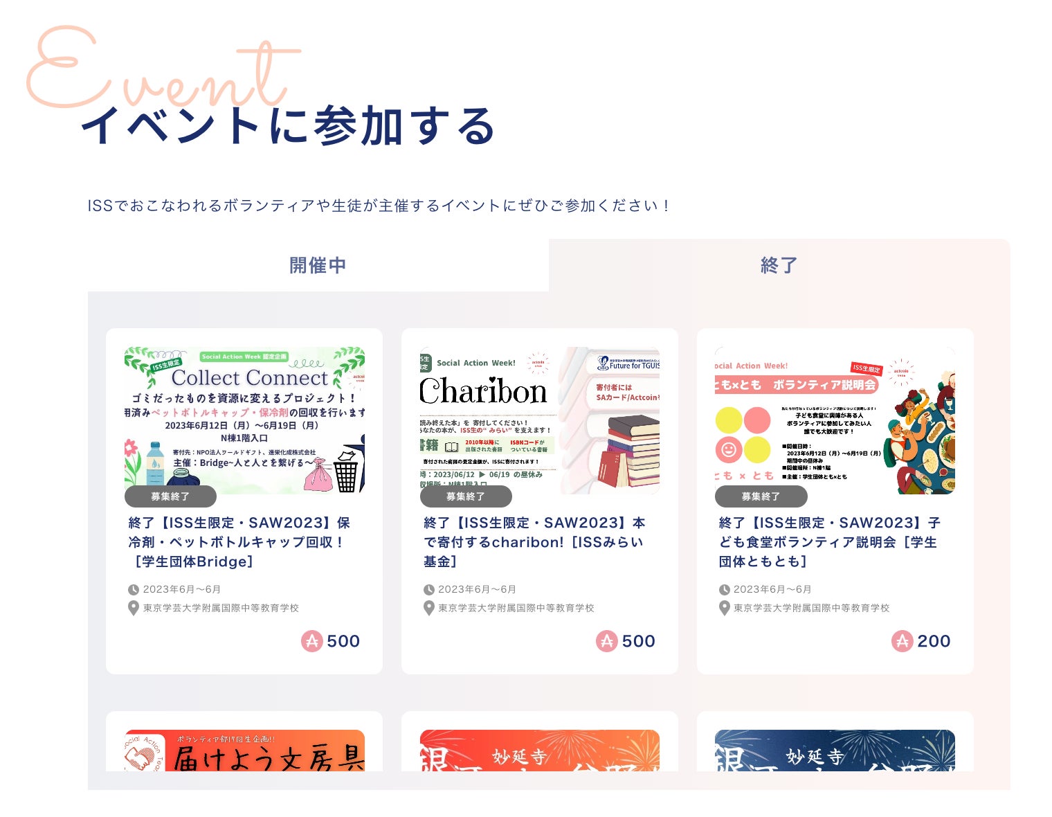 そこでactcoinの仕組みを活用して、全校の社会貢献活動のDX化をスタート。まずISS×actcoinの特設ページを開設し、ページ上で社会貢献活動のイベントを全て一覧で閲覧できるようになります。さらに生徒がactcoinを通じて、このイベントに参加することで、履歴が特設ページにリアルタイムに反映されます。