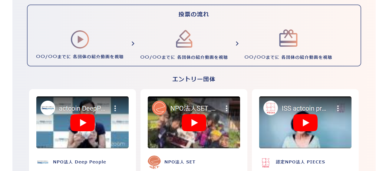 こうした課題意識をもとに、ISS×actcoinでは生徒たちがアクションすることで寄付が届き、寄付先の団体についても知り交流しながら選ぶことが出来る仕組みを構築しました。具体的には、上述の特設ページの総コイン数(≒全校生徒の社会貢献活動の成果)10万コインごとに1万円の寄付がNPO団体に届きます。さらにその寄付先も、候補団体の取り組みを学んだ生徒によるアンケート結果を反映して決定されます。加えて、寄付の投票が終わった後には、NPO団体と生徒が対話をする機会を設けます。