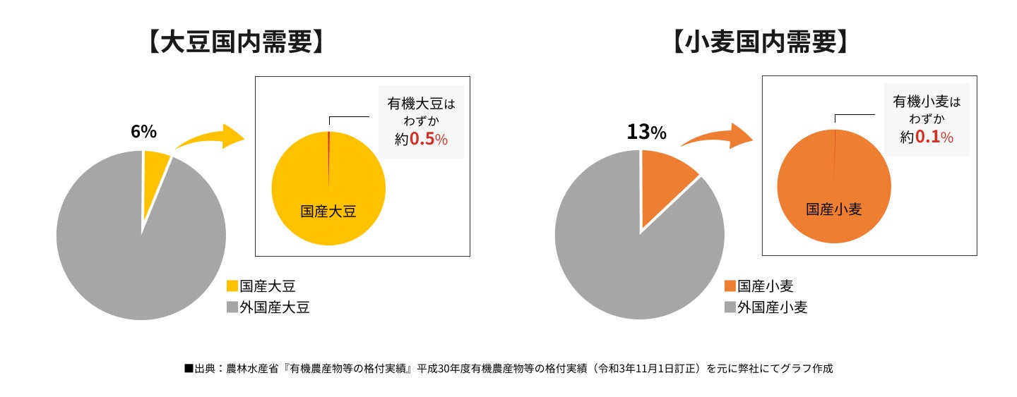 原材料である丸大豆と小麦は、有機JAS認定の国産を使用しております。禁止化学肥料や禁止農薬を使用せず育てられた遺伝子組み換えなしのオーガニック農産物です。国内に流通している大豆も小麦もほとんどが外国産。数少ない国産大豆、国産小麦の中でも有機栽培されたものは極僅かです。国産大豆のうち、有機栽培されたものは約0.5%、国産小麦では約0.1%と大変稀少な原料を使用しています。