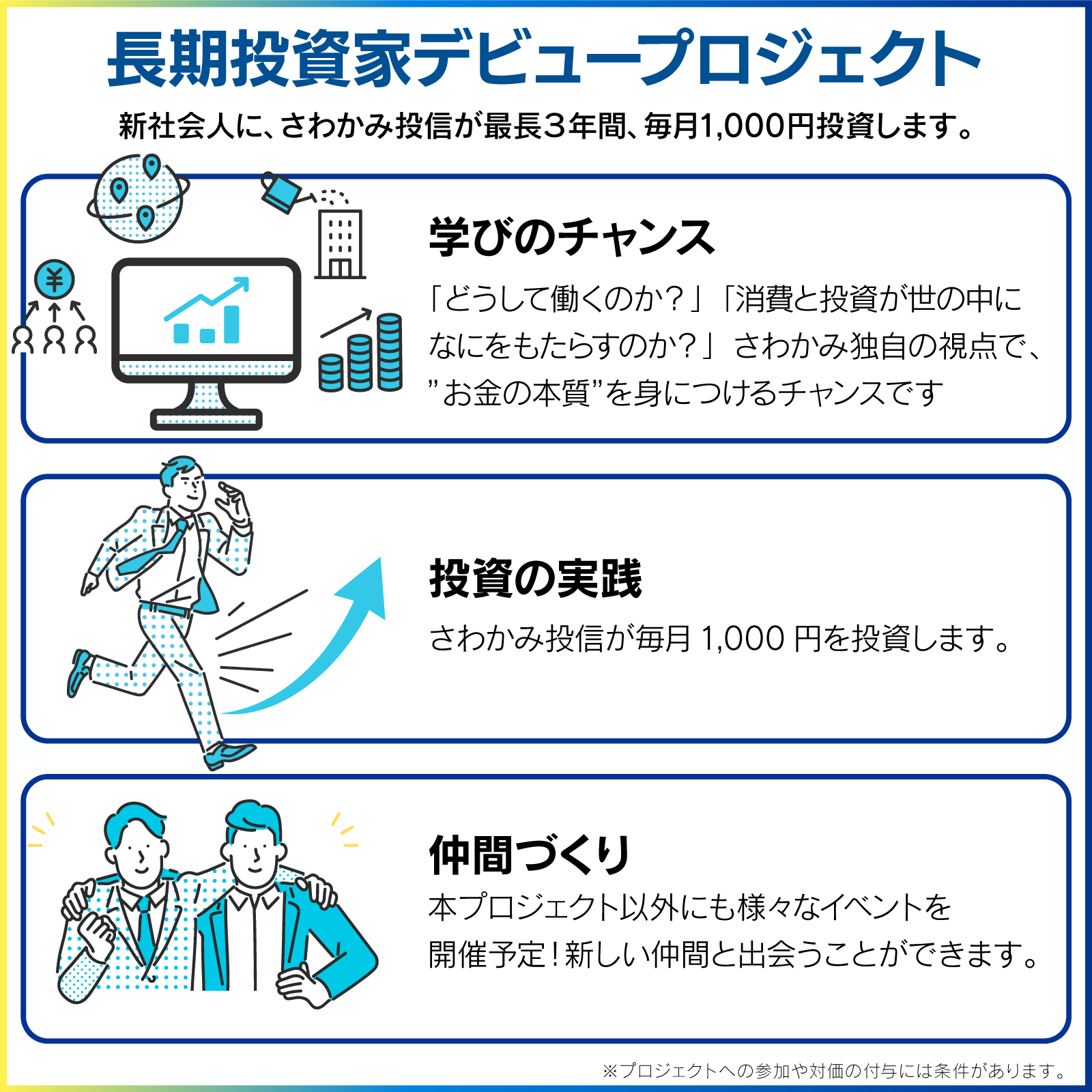 本プロジェクトでは、多くの人が新社会人になるであろう年代層の若者たちに、これから始まる3年間に渡り毎月1,000円を投資します*5。それにより、さわかみファンドを通じて長期投資を学ぶきっかけにしていただきたいと考えています。同時に、「未来につながる自己投資の場」として、毎月さわかみ投信がデザインする学びの機会に参加してもらいます。その他にも、考える機会、そして新しい出会いの機会に参加することもできます。そのプロセスが自分磨きのきっかけとなることを想定しています。