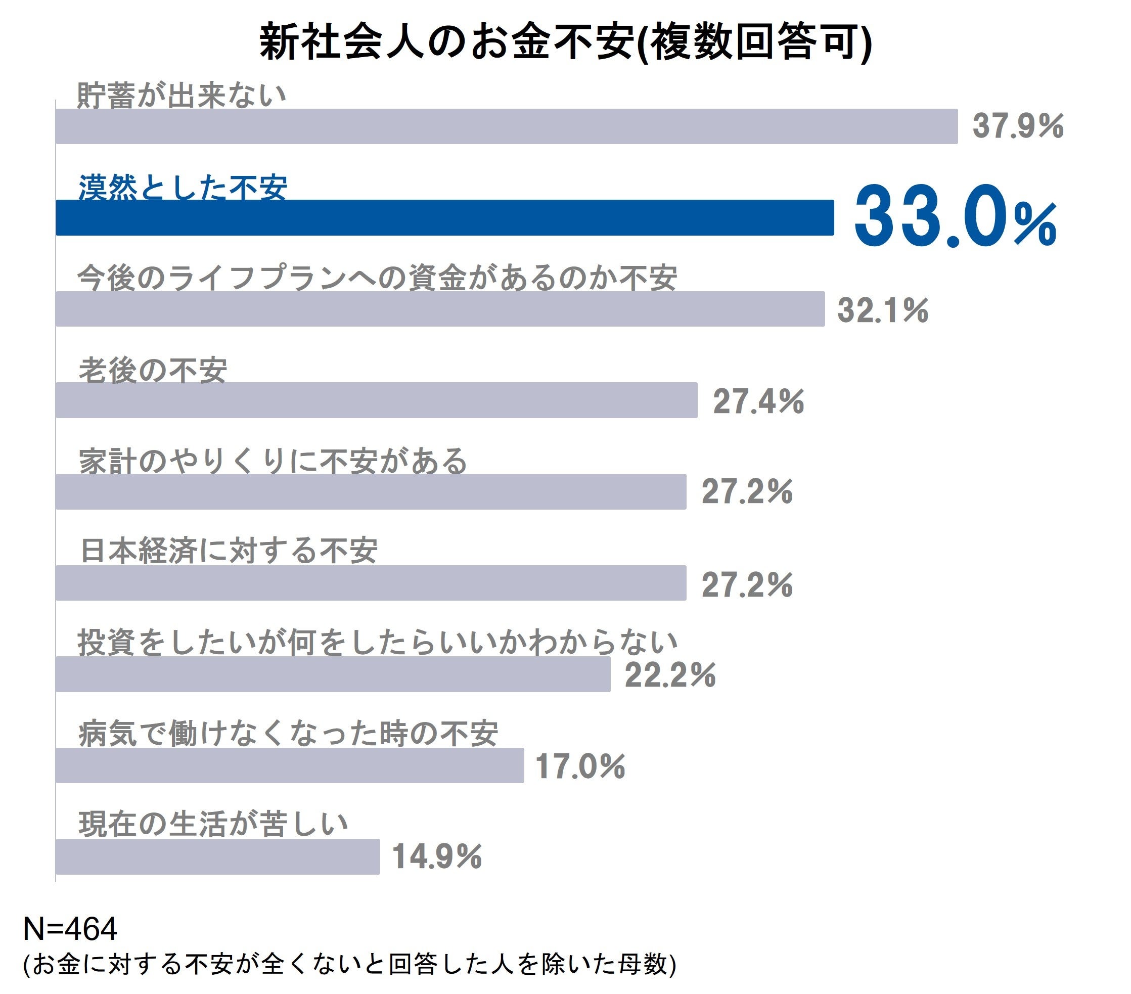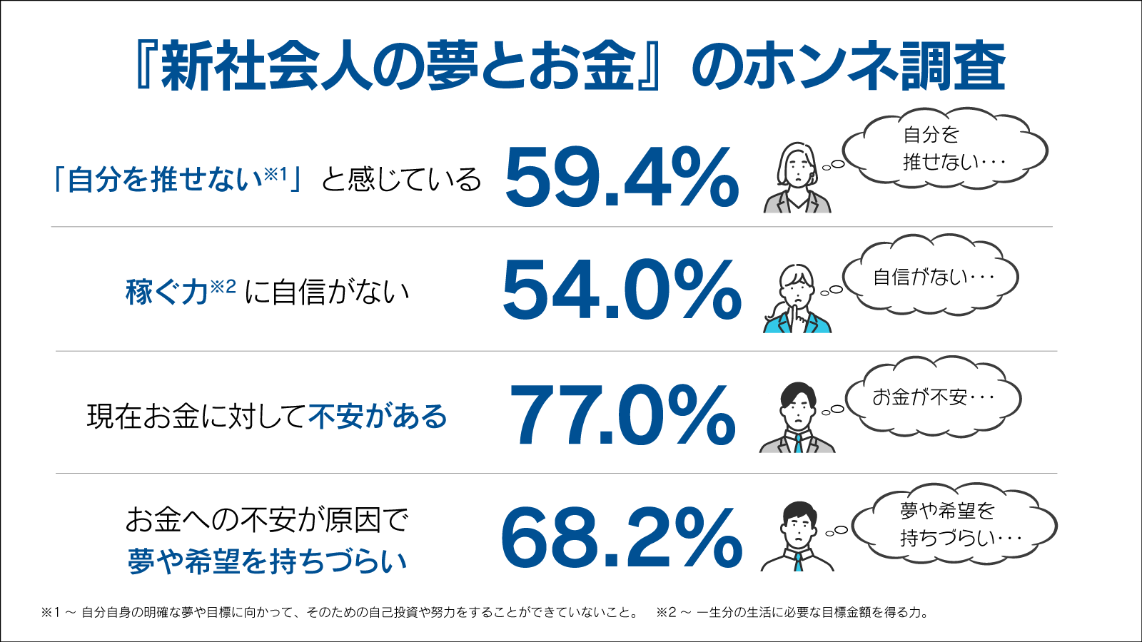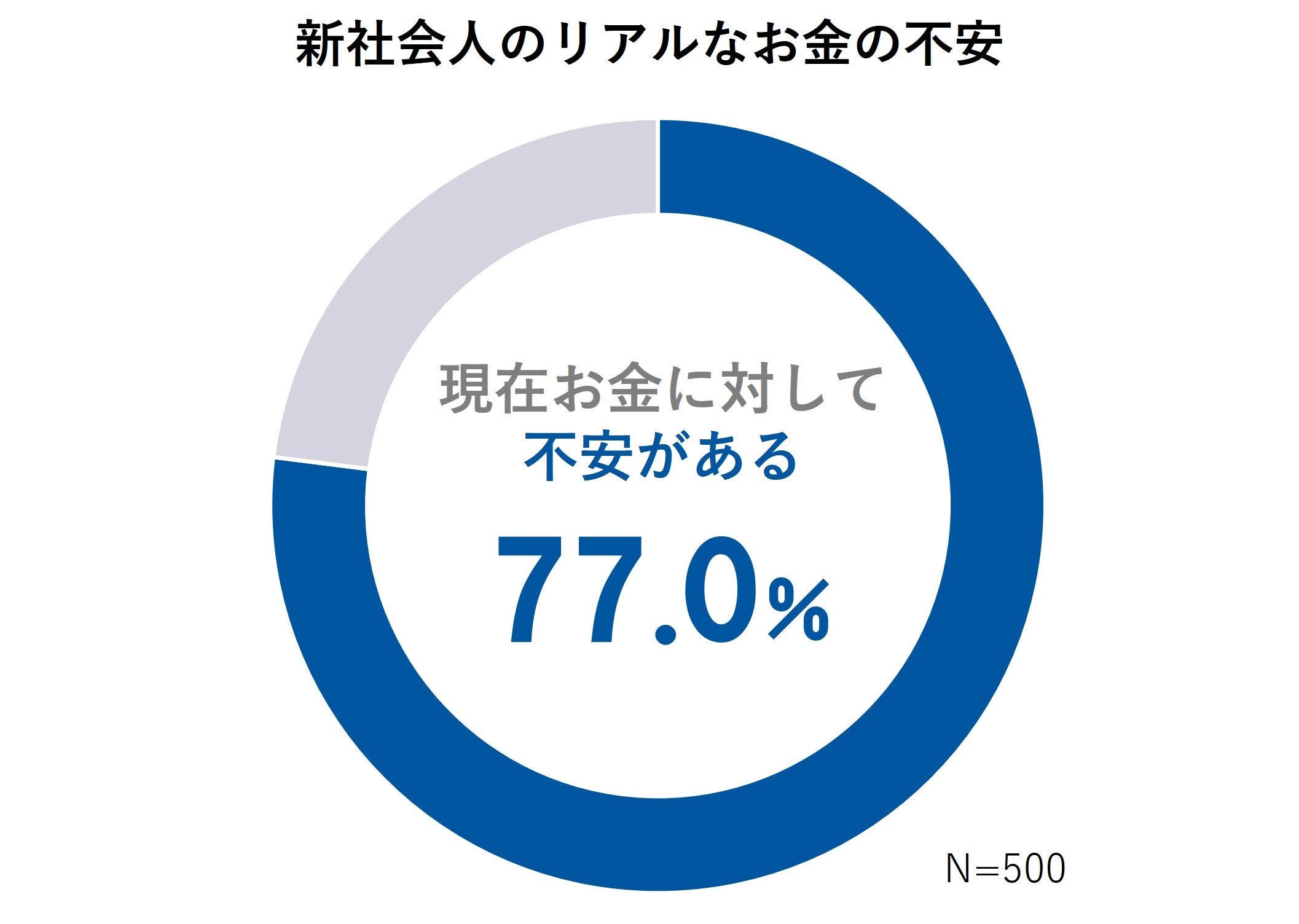 また、稼ぐ力に自信がないことも影響し、77.0%の新社会人が、「お金に不安を感じている」ことが明らかになりました。