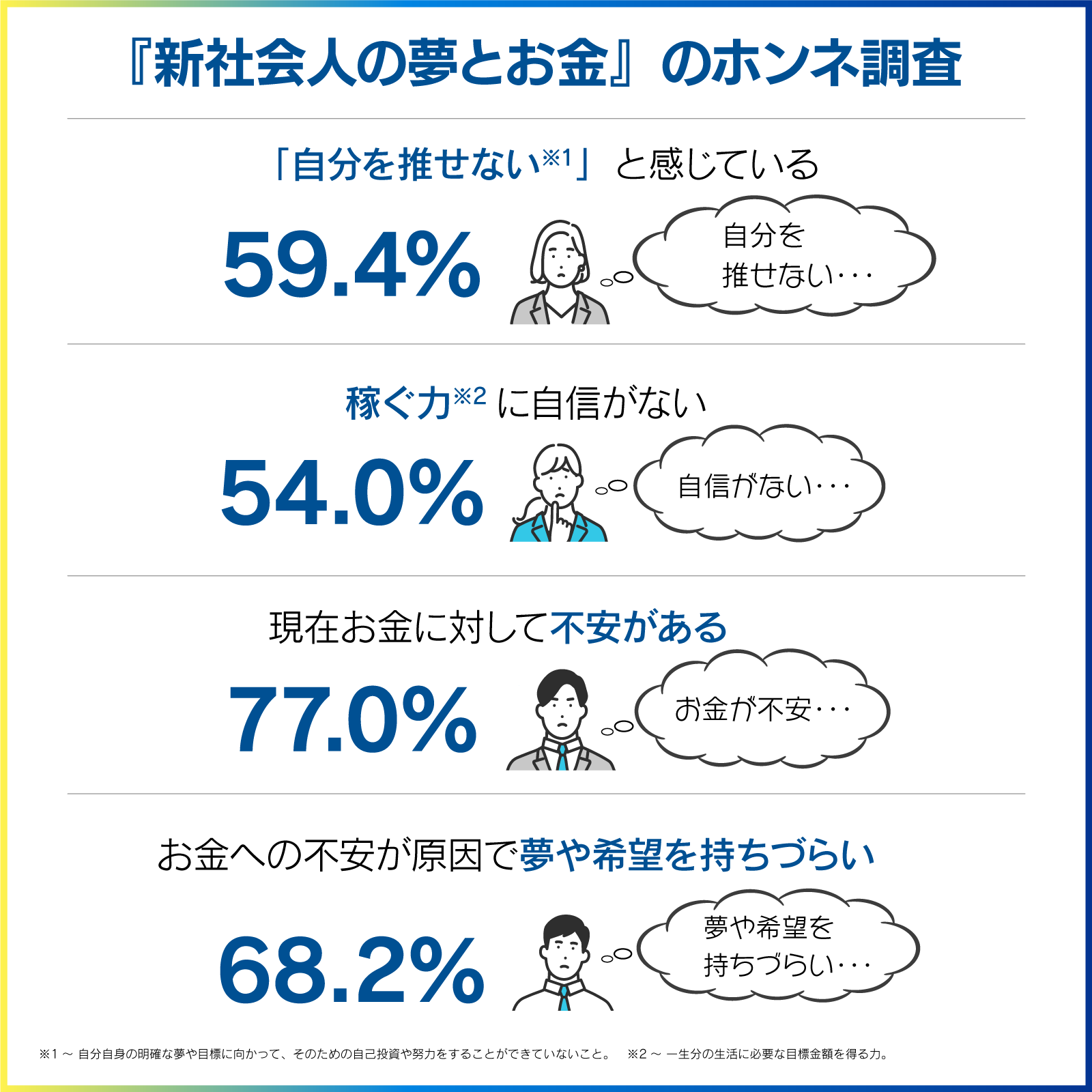 プロジェクト始動にあたり、今年新社会人となった23歳を対象に「『新社会人の夢とお金』のホンネ調査*2 」を実施しました。その結果、多くの新社会人がお金が不安で夢を持てていないことが判明。本プロジェクトを通じて、次世代を担う若い世代が少しでもお金の不安から解放され、”自分を推せる”ようになり、そして未来を創造していくためのきっかけをサポートできたらと考えております。