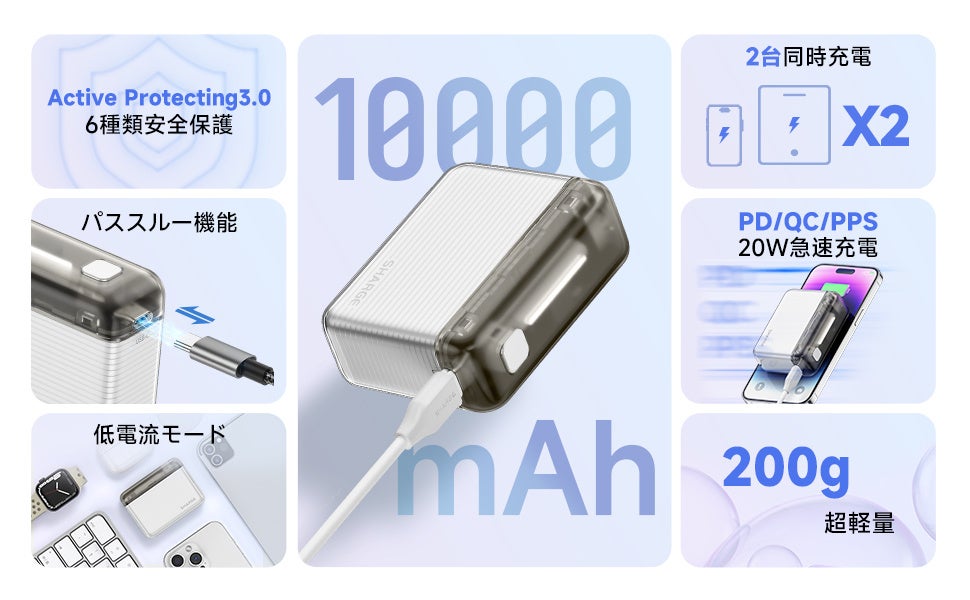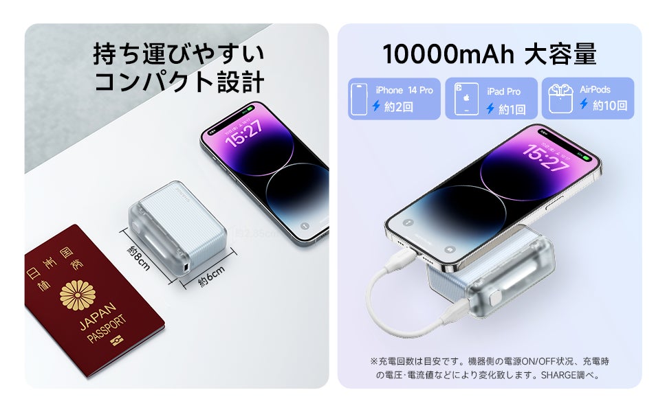 10000mAhの大容量で、iPhone14を約1回、AirPodsを約10回以上充電できます。最大20Wの出力により、スマートフォンやタブレット端末など様々な機器へ急速充電が可能です。外出時でも、充電切れの心配はありません。さらに、パススルー充電機能も搭載しており、充電と給電が同時に可能です。(※充電回数は目安であり、機器側の電源ON/OFF状況、充電時の電圧・電流値などにより変化します。SHARGE調べ)