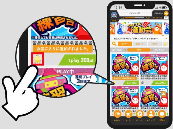 この機能は気になった景品を「お気に入り」に登録しておくことで、簡単に景品を探しだすことができます。