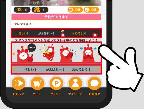 他のプレイヤーに対して、プレイ画面から「もうちょっと」や「おめでとう」の気持ちを定型文やスタンプで伝えることができます。