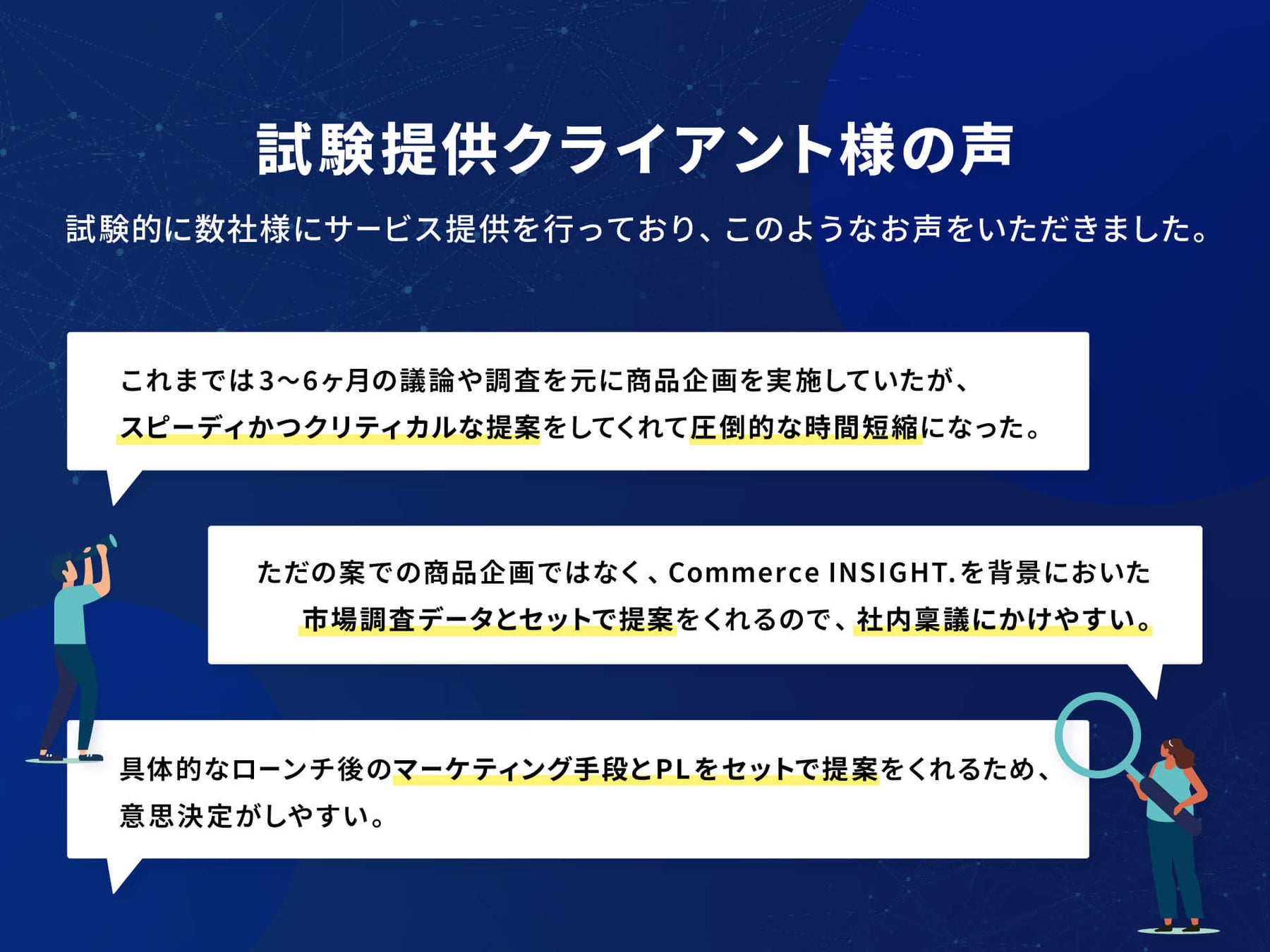 リサーチから従来の商品企画までを担って欲しいというお問い合わせが非常に多く、この度「Commerce INSIGHT.」を活用することで、多様なニーズにスピーディにお応えすることが可能となりました。既にサービスを提供させていただいているクライアント様からも非常に好評のお声をいただいており、多くの事業者様の課題解決となる自信を持って正式にサービス化させていただくことと致しました。