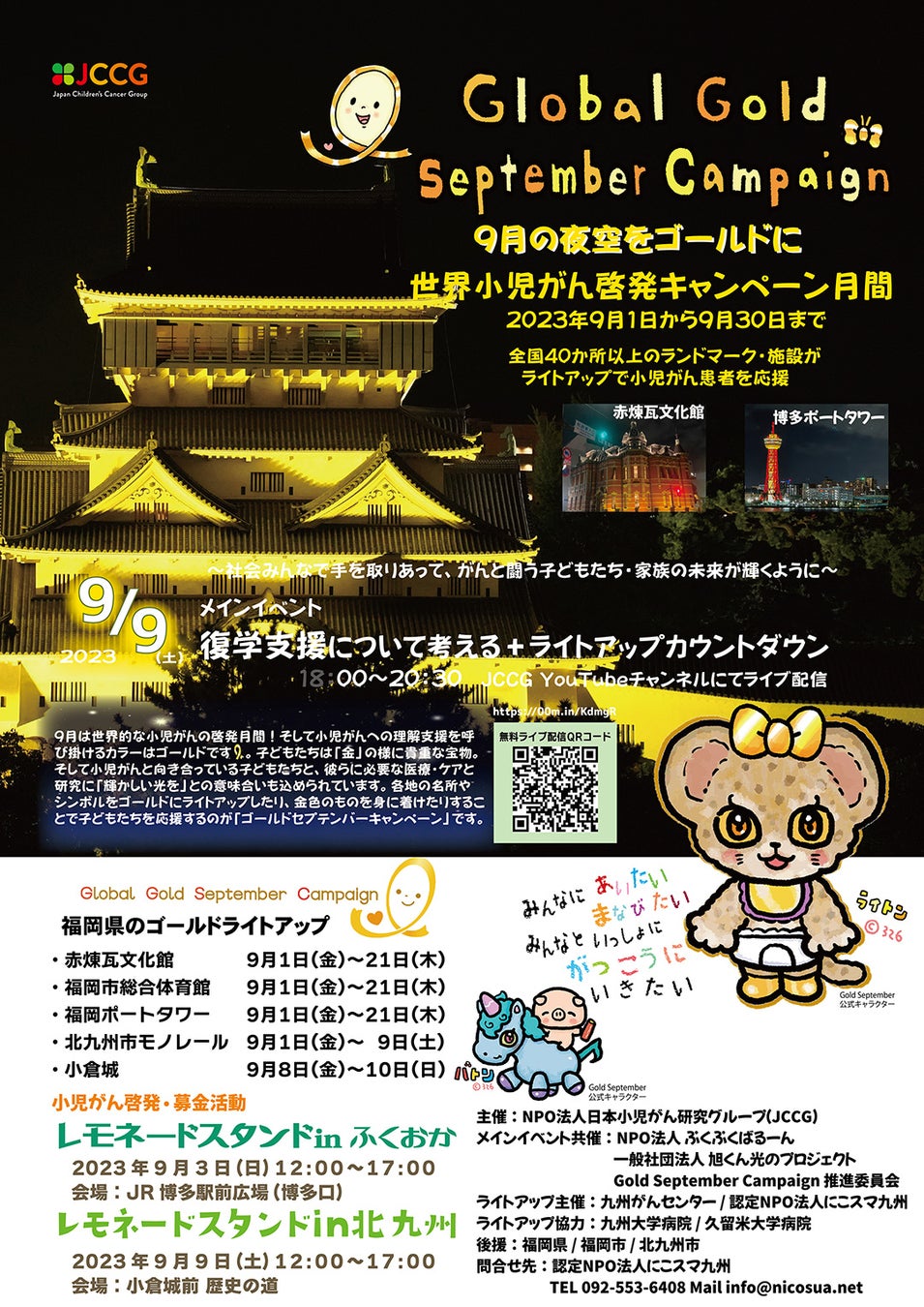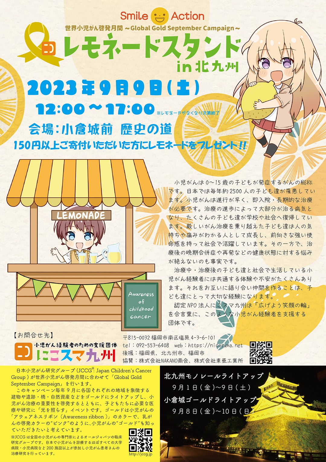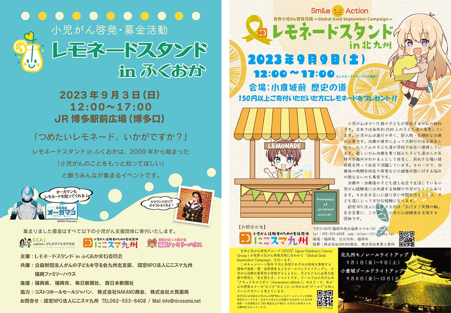 また小児がんの啓発・募金活動としてレモネードスタンドを9月3日(日)に博多駅で、9月9日(土)に小倉城前で開催します。