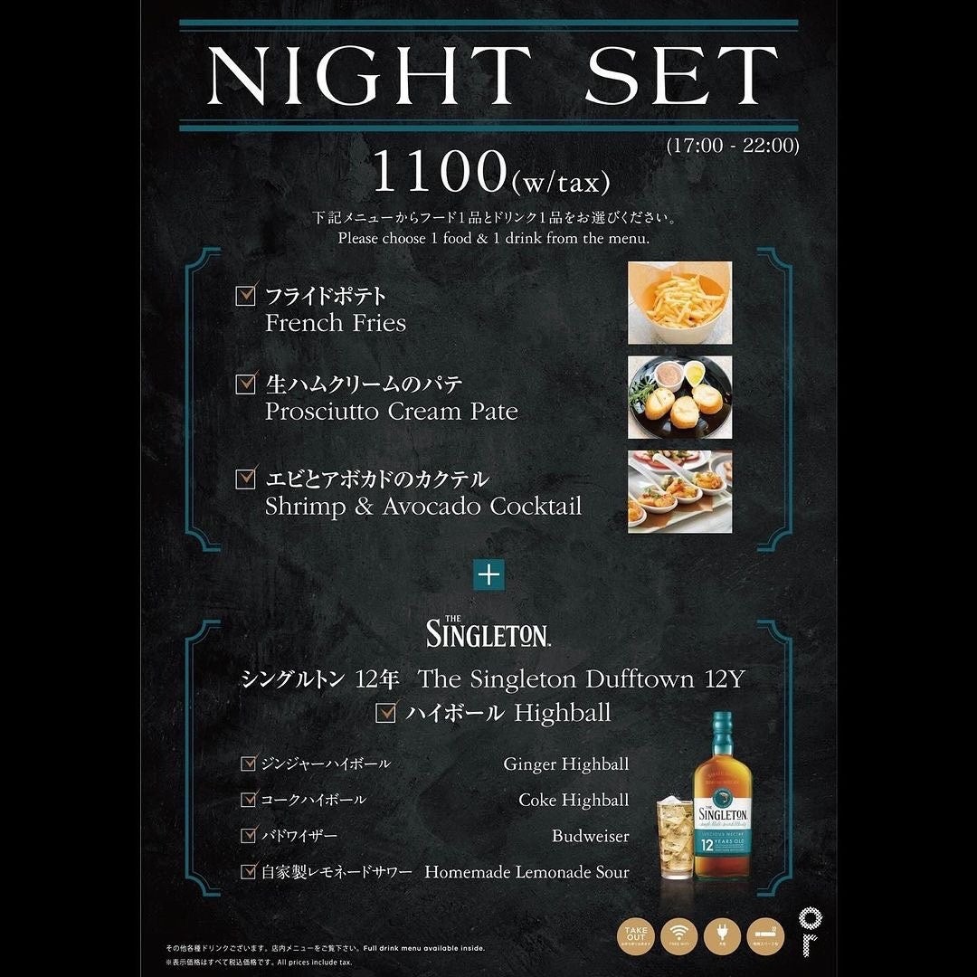 毎日17:00-22:00の間『NIGHT SET』が登場。フードメニューから一品とハイボールやその他のドリンク一杯の組み合わせで1,100円(税込)でご提供。