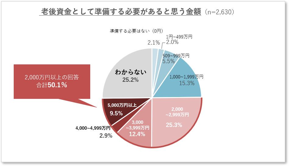 - 老後資金として必要だと思う金額については、約半数が2,000万円以上の金額を回答。