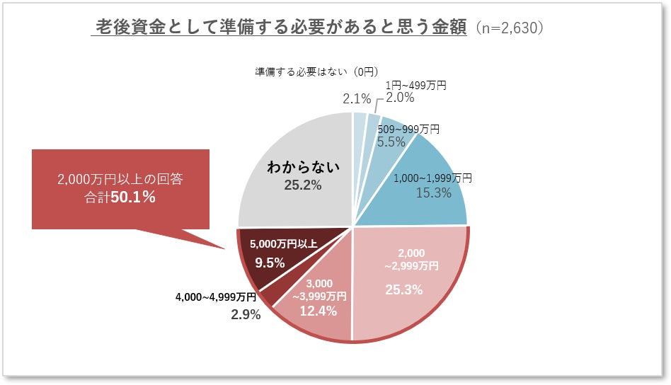 A. 2,000万円以上の選択肢の回答はあわせて50.1%にのぼった。また、「わからない」の回答も25.2%にのぼった。