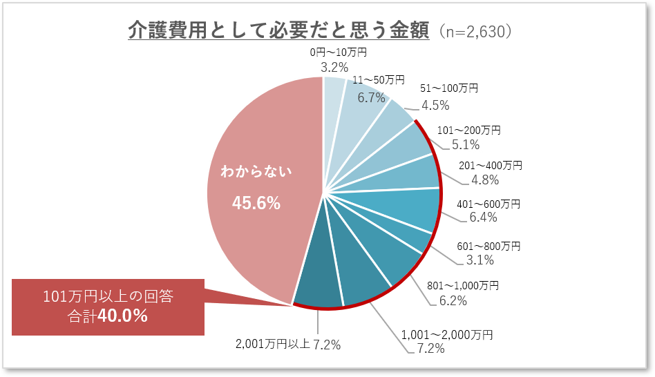 - 「介護費用がどの程度必要か」について、約4割が101万円以上の金額を回答。一方、「わからない」と回答した人も4割以上に。