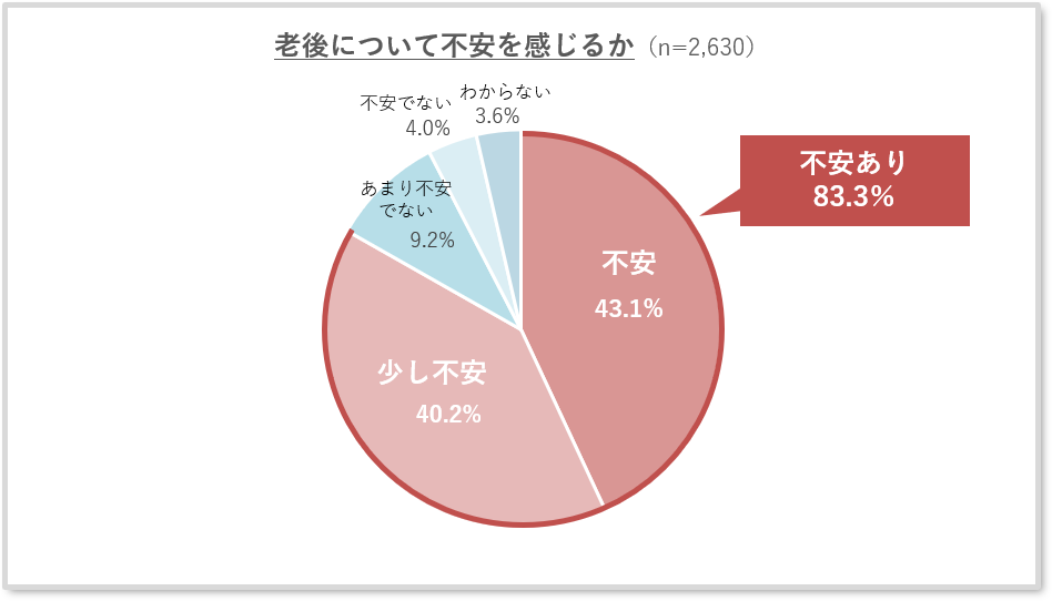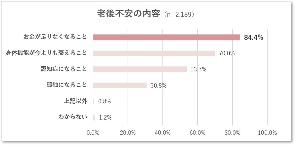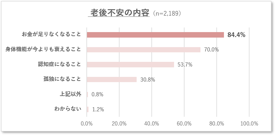 - 老後への不安を抱える人は8割以上、不安の内容は老後資金の不足が最多。