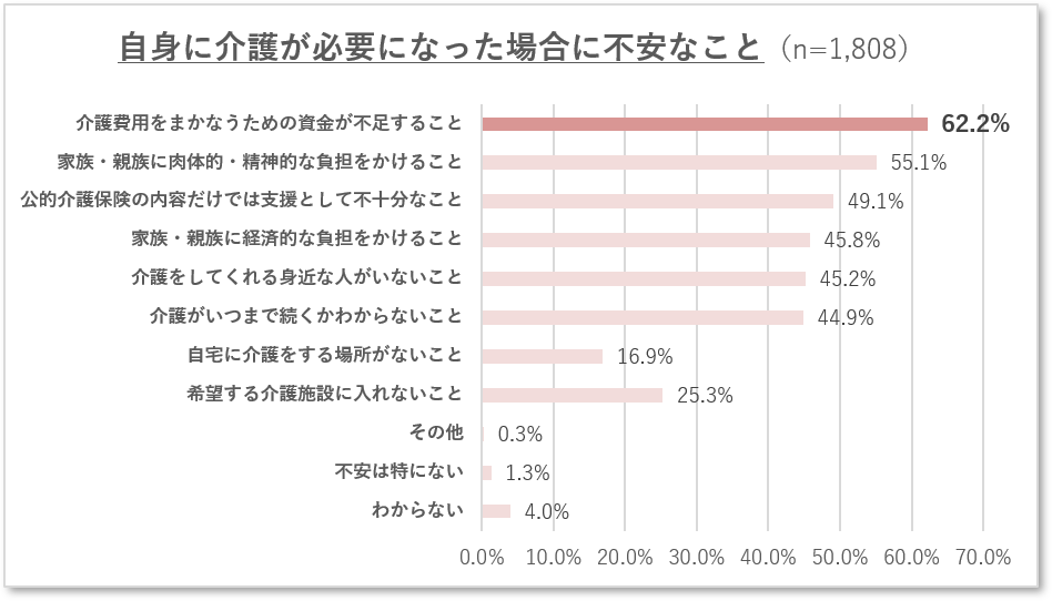 A.介護が必要な状態になった場合の不安の内容は「介護費用のための資金が不足すること」が最多で62.2%にのぼった。
