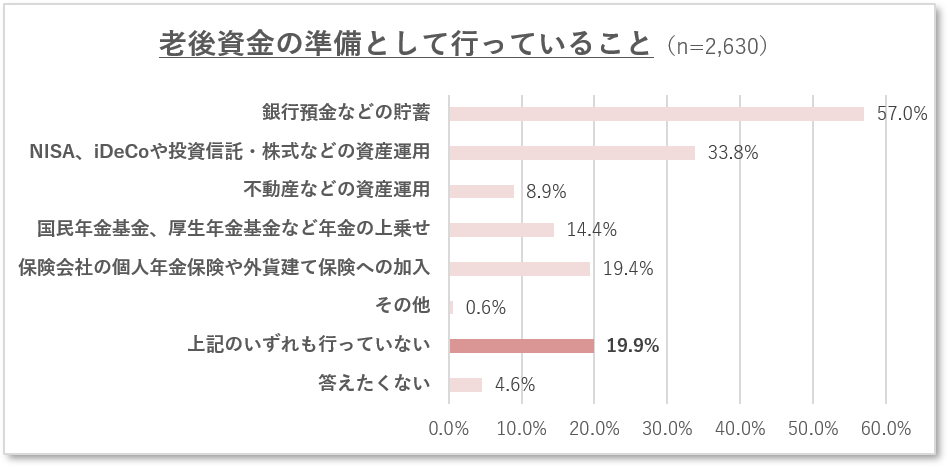 - 老後資金の準備について、約2割は貯蓄を含め「行っていない」と回答。