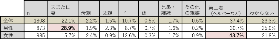 男女別にみると、女性で「第三者」の回答割合が、男性で「夫または妻」の回答割合が相対的に高い。