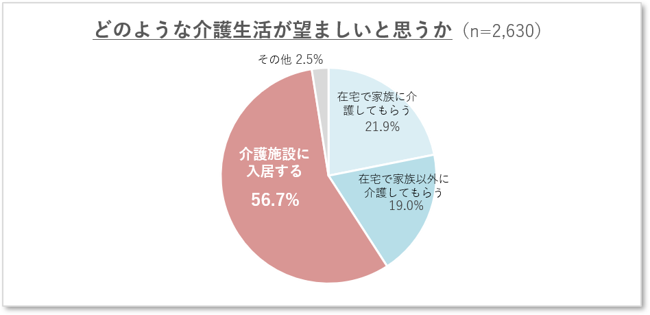 他方で、将来の介護生活として「家族ではなくヘルパーなど第三者に介護を依頼したい」、「在宅介護ではなく介護施設へ入居したい」と相応の介護費用を必要とする生活をイメージしている方が多い結果となりました。