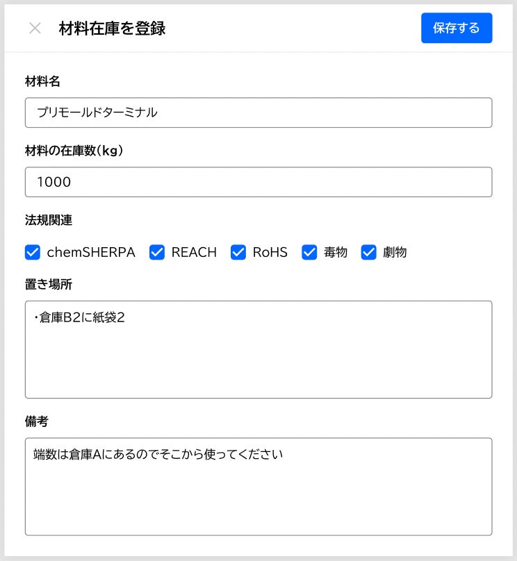 Sotasでは製品登録の際にSDS(安全性データシート)の添付をするだけで、毒劇物の情報を自動で取り込み、当該製品の取引を5年間自動保管、さらにはレポートを出すことも可能です。そのほかにも、REACHやRoHS、電子帳簿保存法、インボイス制度にも対応しています。