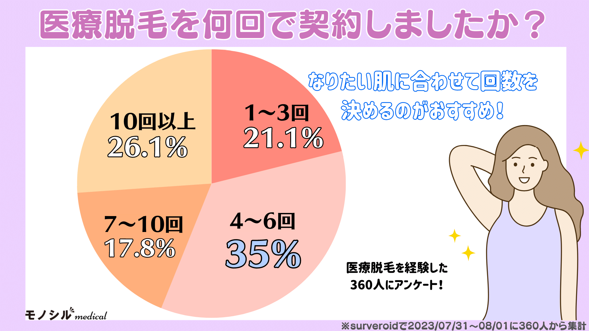 医療脱毛を何回で契約したかというアンケート調査に対して、「1〜3回」が21.1%、「4〜6回」が35%、「7〜10回」が17.8%、「10回以上」が26.1%という結果になりました。